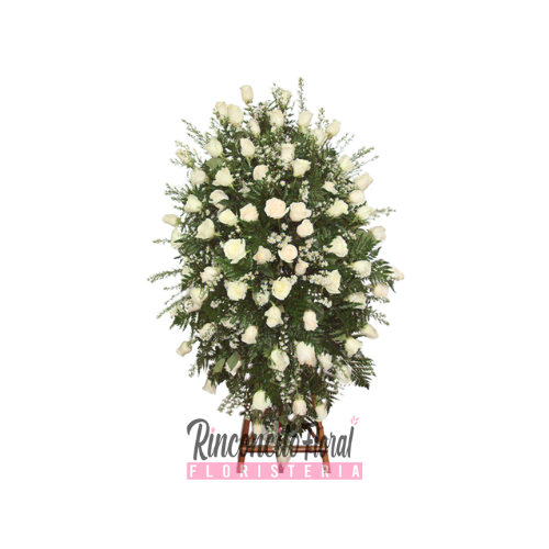 Envuelve con un abrazo cálido de amor y esperanza a la familia en duelo a través de este magnífico pedestal floral. Con 60 rosas blancas y follajes verdes cuidadosamente dispuestos sobre un trípode de bambú o madera, este arreglo floral representa un mensaje conmovedor de consuelo y apoyo.